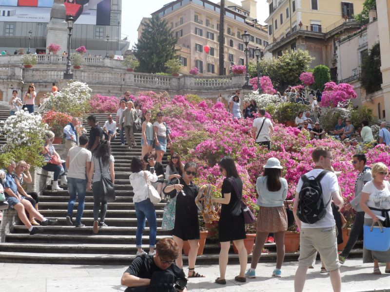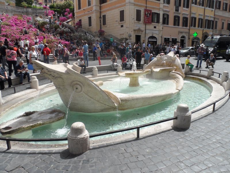 De Spaanse trappen bevinden zich op het Piazza di Spagna. Voor de Spaanse trappen staat de Fontein van de lekkende boot. De Spaanse trappen behoren bij de kerk Trinitá dei Monti van Lodewijk XII. Toen wij er waren was de trap vol met bloemen. Ik ben niet bovenaan de trappen geweest maar het was wel een heel mooi plaatje, zeker met die bloemen en de kerk op de achtergrond. De fontein vond ik zelf niet heel indrukwekkend maar verder niet lelijk. Je kon nog de beschadigingen van de Feyenoord supporters erop zien. De trappen met de bloemen en de fontein zagen er heel vrolijk en mooi uit.