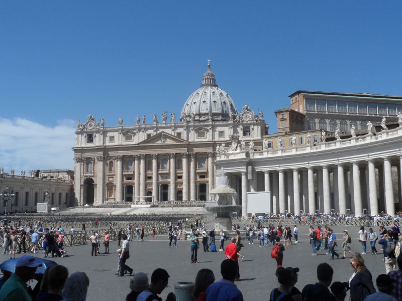 Dit is de grootste kerk van de wereld en de indrukwekkendste kerk die ik ooit heb gezien. Hij staat in Vaticaanstad en ook daar was het super druk. De buitenkant van de kerk is heel mooi en wit. Vanuit de kerk omringen als het ware twee ‘armen’ gebouwd uit zuilen het plein waar drie fonteinen staan. Een grote in het midden en twee kleine, ieder aan een kant. De voorkant van de kerk zelf was heel mooi, met mooie versieringen en details. Op de kerk stonden allemaal beelden en iets daarachter zag je de koepel van de kerk.