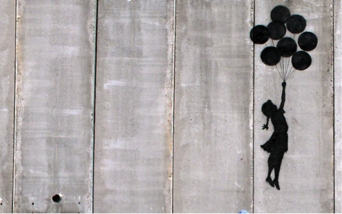 Een ander voorbeeld van straatkunst is streetart met sjablonen. Beroemde straatartiesten zoals Banksy maken straatkunst op deze manier. Je tekent dan een afbeelding en maakt daar dan een sjabloon van (in het groot eventueel). Die zet je dan op een muur bijvoorbeeld en teken je dat sjabloon in met graffiti of verf. Dit gaat veel sneller dan een hele tekening spuiten dus heb je minder kans dat je gepakt wordt door de politie. Banksy maakte hele mooie afbeeldingen zoals deze: